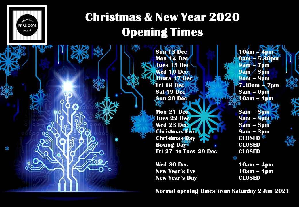 Franco S Barbering Lounge Christmas New Year 2020 Opening Hours Boxing Day Specials Canada